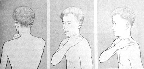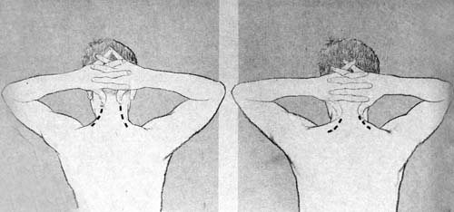 4. เลื่อนนิ้วหัวแม่มือทั้ง 2 มาที่แนวเส้นนวด (หมายเลข 6) กล้ามเนื้อด้านหลังข้างคอทั้ง 2 ข้าง เริ่มจากจุดใต้ตีนผมลงมา 1 นิ้ว กดไล่ลงมาบริเวณระหว่างคอกับบ่าหลังจากนั้นให้เปลี่ยนเป็นใช้นิ้วกลางและ นิ้วนางของมือขวาอ้อมมากดที่บ่าซ้าย และสลับกับมือซ้ายอ้อมมากดที่บ่าขวา ไล่กดจากบ่าไปถึงปุ่มกระดูกบริเวณไหล่