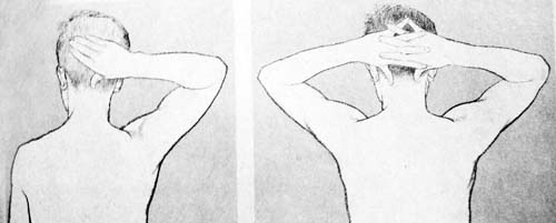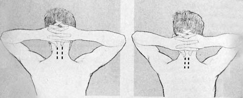2. ประสานมือเข้าด้วยกันบริเวณท้ายทอย ใช้นิ้วหัวแม่มือทั้ง 2 กดที่จุดข้างกล้ามเนื้อต้นคอด้านหลังทั้งสองข้างตรงรอยบุ๋ม (หมายเลข 4) ทั้ง 2 ข้างพร้อมกัน ค่อยๆเพิ่มแรงกด