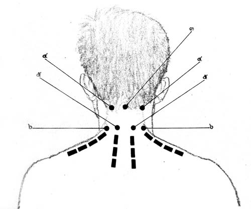 หมายเลข 4 จุดข้างกล้ามเนื้อต้นคอด้านหลังทั้งสองข้างตรงรอยบุ๋ม