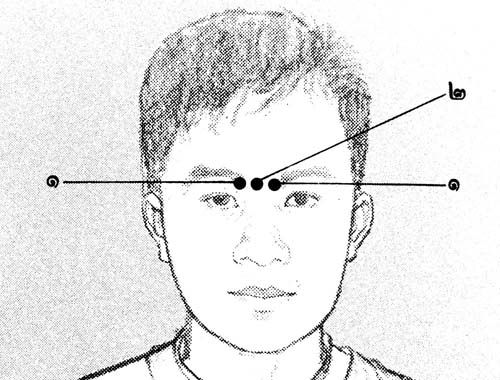 หมายเลข 2 จุดตรงกลางระหว่างหัวคิ้ว