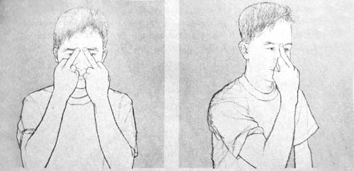 ทีนี้ เปลี่ยนมากด ด้านหน้ากันค่ะ ใช้นิ้วกลางทั้ง 2 มือกดที่จุด 2 จุดใต้หัวคิ้วทั้ง 2 ข้างด้วยแรงพอสมควร หลังจากนั้นใช้นิ้วกลางกดจุดตรงกลางระหว่างหัวคิ้วด้วยแรงพอสมควร
