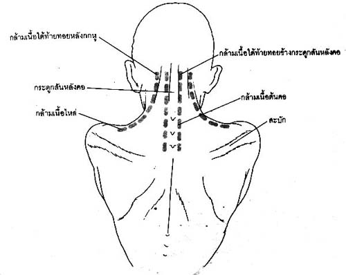 หมายเลข 5 แนว เส้นนวดอยู่ที่กล้ามเนื้อด้านหลังของคอทั้ง 2 ข้าง ชิดกับแนวกระดูกคอ เริ่มจากจุดใต้ตีนผม 1 นิ้วมือลงมาจนถึงระดับส่วนบนของกระดูกสะบัก